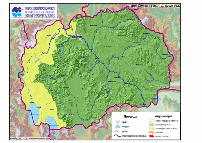 Управата за хидрометеоролошки работи (УХМР) објави хидролошко предупредување за утрешниот ден, 19 ноември 2025 година. Според најновата карта за хидроаларм, западниот и југозападниот дел на Република Северна Македонија се означени со жолта боја, што укажува на „потенцијално опасна“ состојба и можност за зголемување на водостоите на реките.