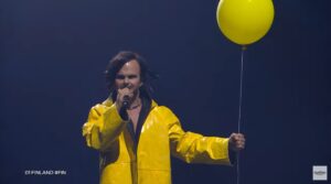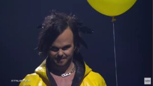 Пејачот се појави со жолт мантил, а во раката држеше и балон што потсети на главниот негативец од хорор филмот „It“ (Toa) – танцувачкиот кловн, Пенивајз.