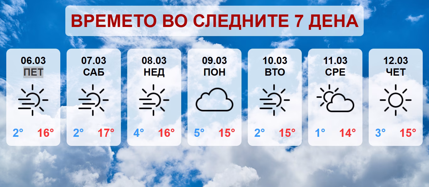 Во недела и понеделник претпладне ќе преовладува променливо облачно и малку посвежо време со слаби локални врнежи од дожд. Од вторник следува период на стабилно време со услови за појава на утринска магла по котлините. Дневните температури ќе бидат во благ пораст.