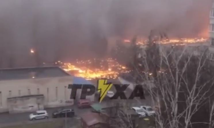 Footage of a fire appeared after a helicopter fell from a height in #Brovary – a terrifying scale of the spread of fire is visible
