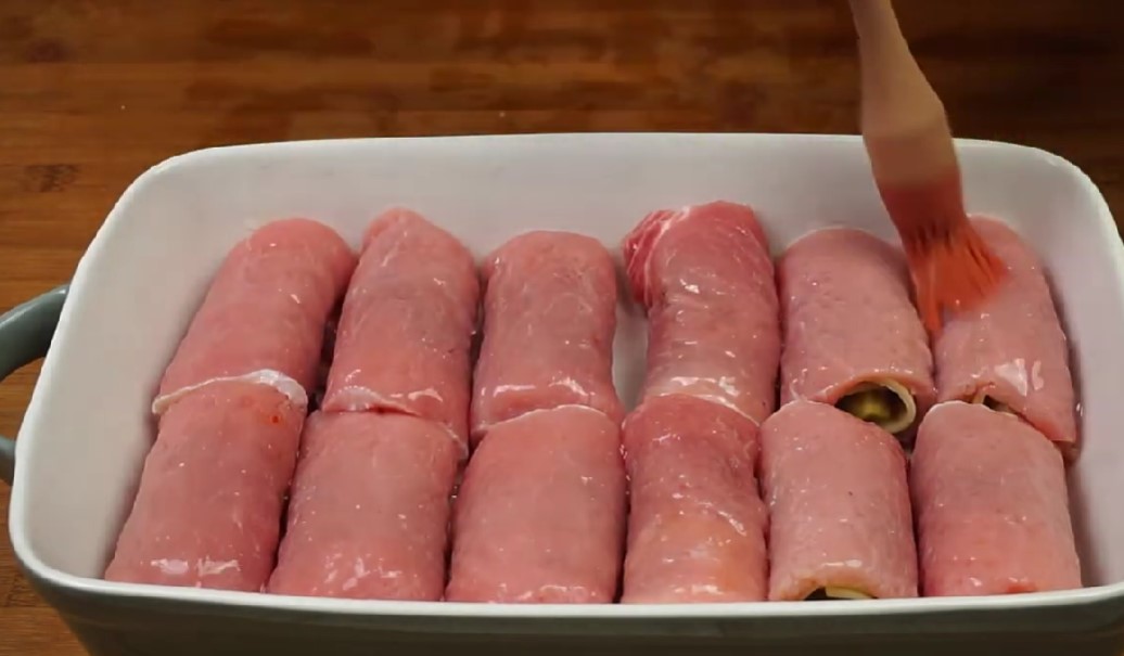 Премачкајте со сенф, па ставете шунка и сирење. Кога ќе ги навлечете на конец, завиткајте ги и прицврстете ги со чепкалки за заби.