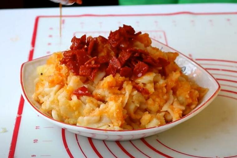Измешајте сè и посолете, па додадете малку пржено ситно сечкано суво месо и ставете го одозгора.