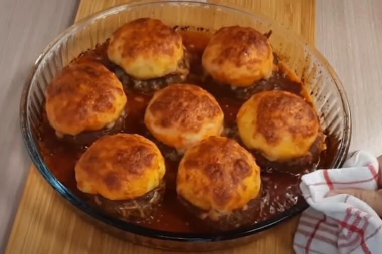 Подготовка: Направете пире од компири и оставете ги на страна. Во посебен сад измешајте мелено месо, ситно исечканиот кромид, ситно сечканиот лук, едно јајце, ситно сечканата зелка и зачините. Сè добро измешајте. Оваа смеса поделете ја на 7-8 топчиња кои ќе ги ставите во стаклен сад. Одделете ги малку топчињата, како да правите корпа од нив. Печете ги во рерна на 200 степени околу 20 минути, а потоа направете топчиња од пире и ставете ги во секоја корпа за месо. Прелијте го со малку доматен сос и рендано сирење, па повторно ставете го во рерна да се зарумени уште малку.