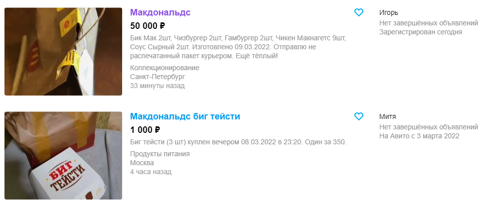 „Го продавам легендарниот пакет од Мекдоналдс, нема да ги има повеќе, тоа е последна шанса да го продадам по поволна цена“, напиша друг со фотографија од Мекмену, кој се продава за 8.000 рубљи. Некои продаваат чизбургери, пилешки хамбургери, Биг Мек.