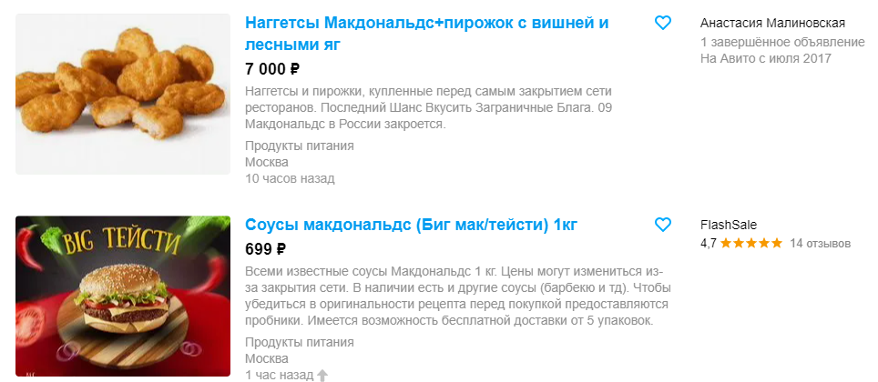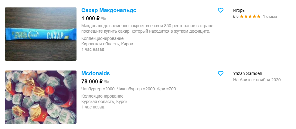 На руската страница за онлајн продажба Avito.ru можете да најдете бројни производи од McDonald’s – од целото McMenu до сосови или дури и шеќер.