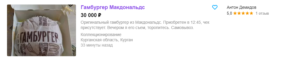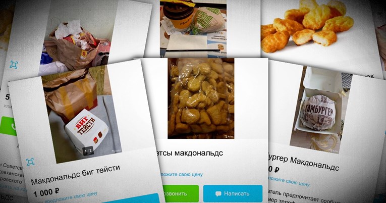 „Бик Мак 2 парчиња, чизбургер 2 парчиња, хамбургер 2 парчиња, пилешки мекнагетс 9 парчиња, сос од сирење 2 парчиња. Произведен на 03.09.2022 година. Неотворено пакување испратено со курир. Уште топло!“ стои до една реклама. Цена? 50.000 рубли.