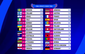 По презентирањето на гласовите на националните жирија, Шведска беше во убедливо водство со 340 поени. На второто место се најде Израел со 177 бодови, трета Италија со 176 бодови, четврта Финска со 150, а Естонија петта со 146 бодови.