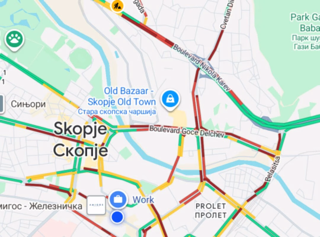 Според мапата за состојбата во сообраќајот, која ја приложија граѓаните, најкритични се централните градски подрачја и главните сообраќајни артерии. Како што може да се забележи, бул. „Гоце Делчев“, дел од бул. „Никола Карев“ и пристапите кон Старата скопска чаршија и Центар се целосно зацрвенети, што означува многу густ сообраќај со застој.