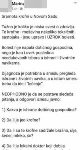 Имено, таа во објавата со наслов „Срам за крофните во Нови Сад“ изјавила дека можеби крофните биле причина за болеста на таткото на девојчето поради „мешавина од токсични состојки“.