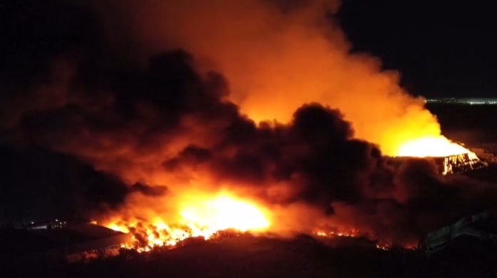 Столб од црн и портокалов чад се издигаше на небото над градот, додека пламенот ја осветлуваше околината, објави АФП.