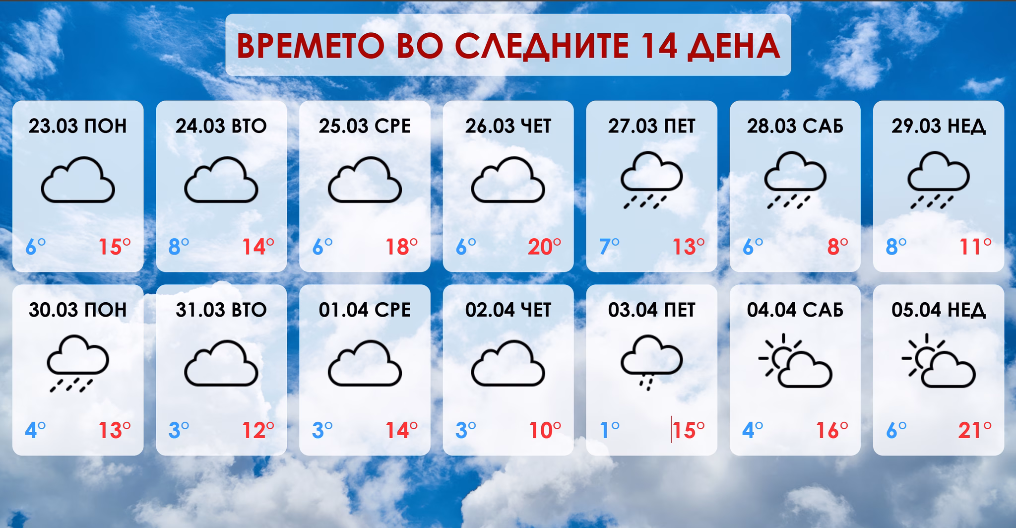 Генерално, следните 14 дена ќе донесат типично пролетно време – променливо, со комбинација од сонце, облаци и дожд, како и постепени температурни осцилации.