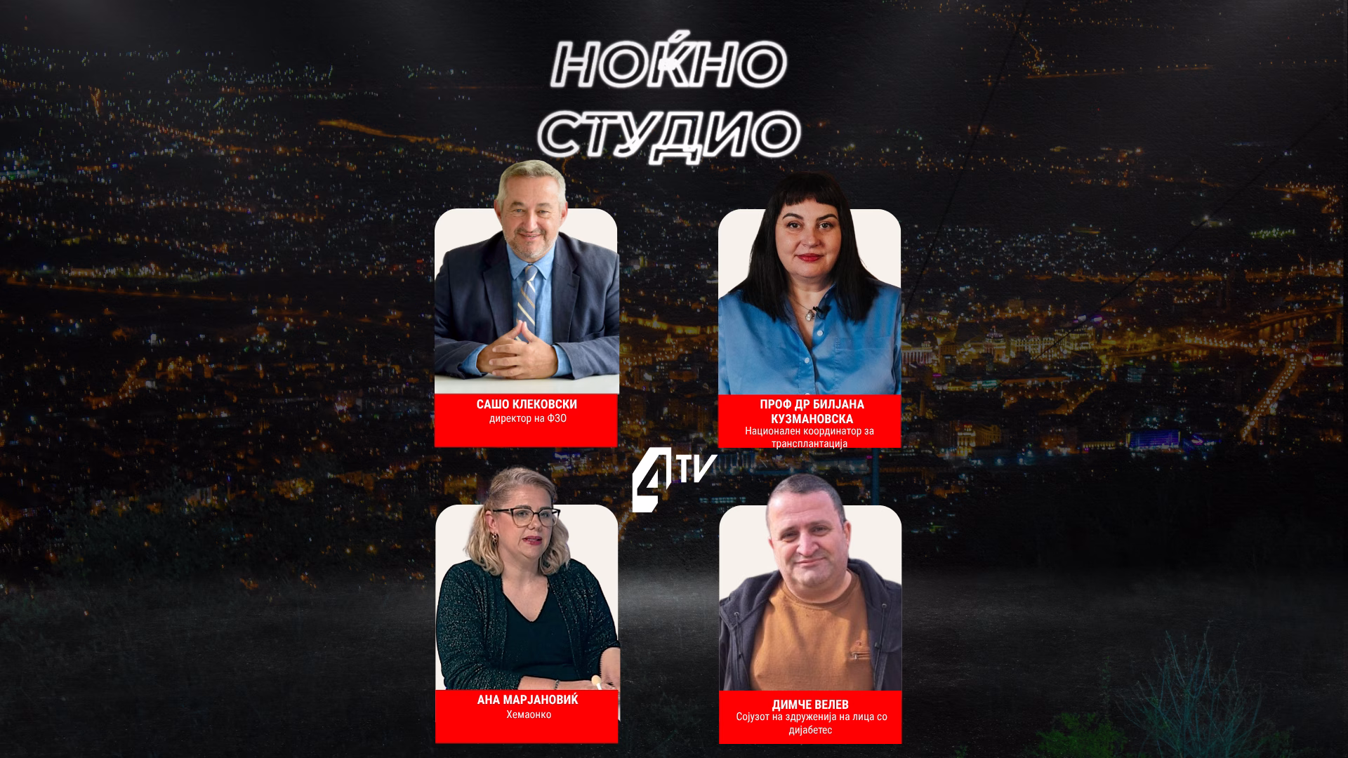 По повод 7 Април – Светскиот ден на здравјето, вечерва во „Ноќно Студио“ на 4TV дебатираме за најважните прашања во нашето здравство. Под мотото за еднаквост и подобра здравствена заштита, ги соочуваме институциите и здруженијата на пациенти.