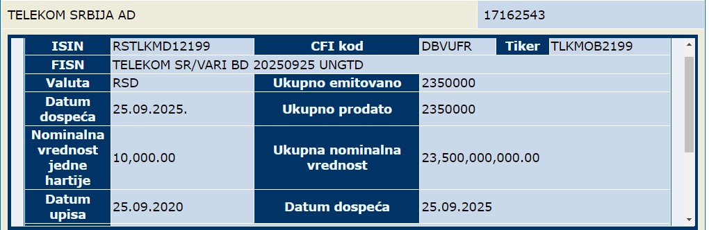„Беа издадени обврзници во износ од 23,5 милијарди динари, со рок на доспевање од пет години и со каматна (купонска) стапка под четири проценти (3M BELIBOR + 2,95 п.п., што е 3,97%)“, објави таа тогаш The National. Банката на Србија нагласи дека овие хартии од вредност се целосно деноминирани во динари и „не носат никаков девизен ризик, што укажува дека компанијата размислувала разумно и одговорно во однос на намалување на пазарните ризици на најниско можно ниво“.