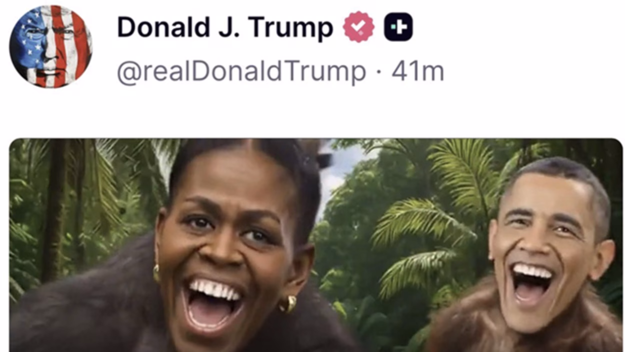 Да потсетиме, Трамп сподели видео од приближно една минута, фокусирано на обвинувањата за кражба на изборите во 2020 година. При крајот на видеото, Обама се прикажани околу една секунда со нивните лица надредени на телата на мајмуните, додека песната „The Lion Sleeps Tonight“ се слуша во позадина.
