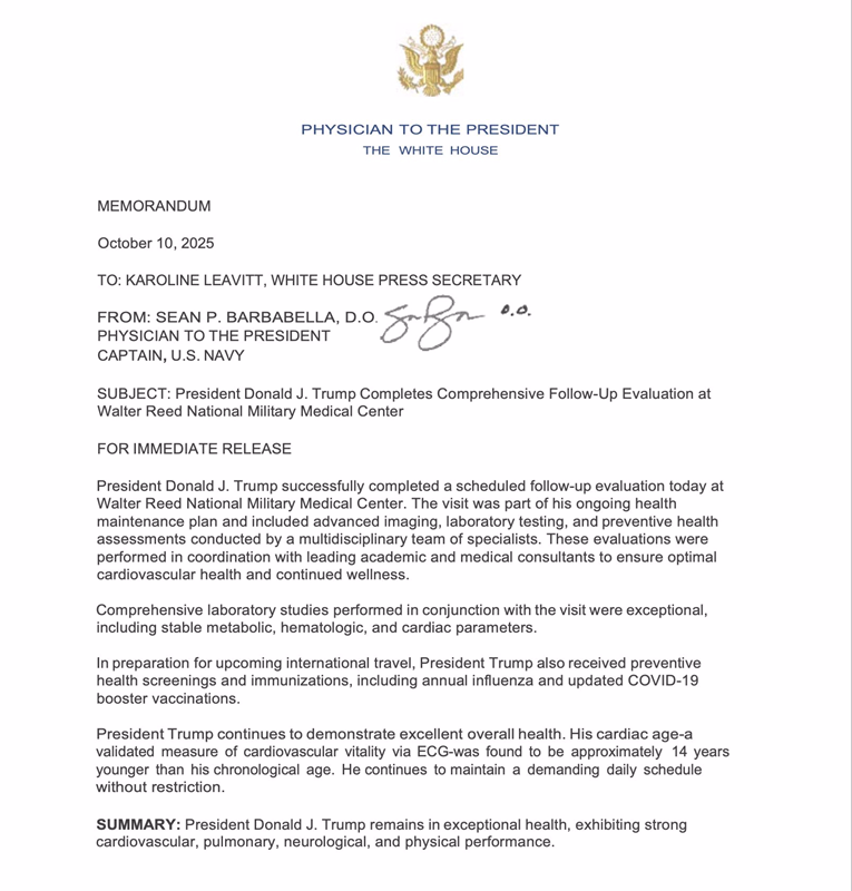 Докторот на Трамп, Шон П. Барбарела, во документот од една страница рече дека Трамп „останува во исклучително здравје, демонстрирајќи силни кардиоваскуларни, пулмонални, невролошки и физички перформанси“.