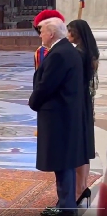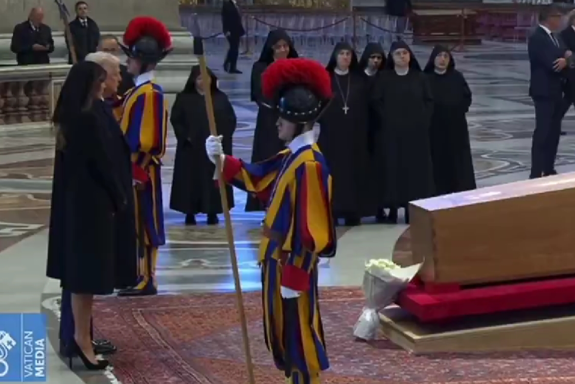US President Donald J. Trump and First Lady Melania pray for a few moments in front of the coffin of Pope Francis in St. Peter’s Basilica, before the funeral this morning. pic.twitter.com/Yp1x5e7E9e