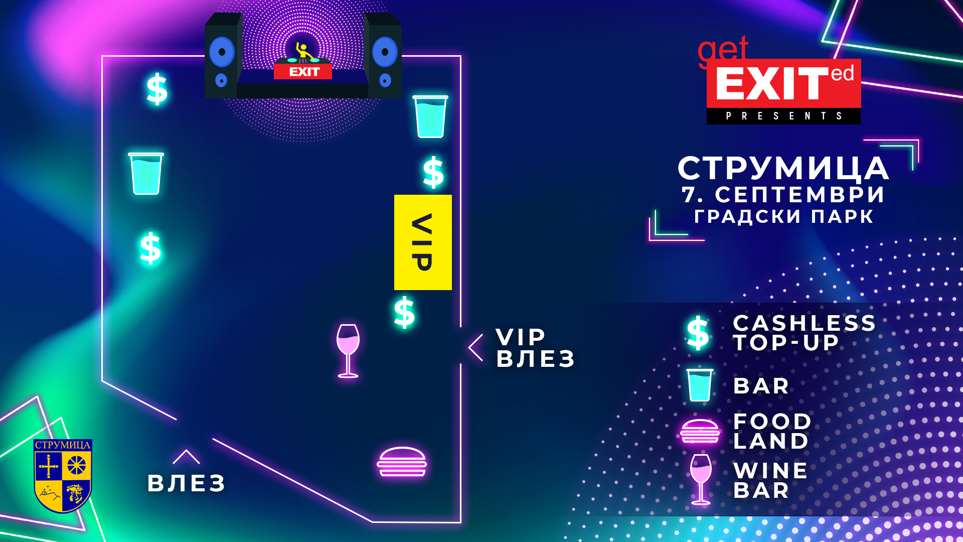 Капиите на струмички Градски парк ќе бидат отворени во 19:00 часот, а публиката во 20:00 часот ќе ја пречека локалниот Џамбо Агушеви Оркестар, еден од најдобрите трубачки ансамбли на Балканот, додека во 21:00 на бината ќе застане омилената регионална уметница Констракта со својот бенд „Земља Грува“! Гитарскиот звук од 22:30 ќе го донесат рок легендите, групата Ван Гог, по која ќе следува исчекуваниот, специјален хибриден настап на светската поп и соул сензација Џон Њуман, кој почнува во 23:50! Од 01:05 публиката ќе ја разигра глобалниот хитмејкер, продуцент и диџеј Бурак Јетер, додека за завршницата на втората по ред Get EXITed журка ќе биде задолжена силната женска поддршка од светот на електронската музика – младата продуцентка и диџејка Lanna од 02:30 и одличните The Geors од 03:30!