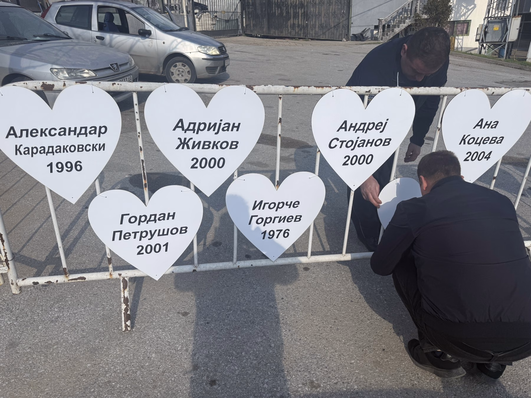 Белиот симбол на срцето и имињата на загинатите претставуваат спомен и знак на солидарност кон семејствата и пријателите на жртвите.