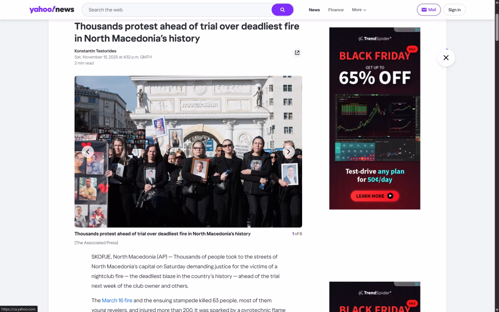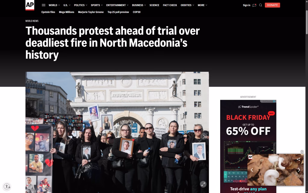Слична е и репортажата на Франс Прес (АФП), која ја пренесе угледниот финансиски магазин „Баронс“ (Barron’s). Под наслов „Илјадници бараат правда за смртоносниот пожар во ноќен клуб во Северна Македонија“, АФП ја пренесува приказната за трагедијата од 16 март, кога пиротехнички средства го запалија преполниот клуб.
