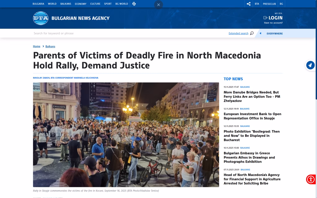 Илјадници граѓани кои денеска маршираа низ Скопје, барајќи правда за 63-те жртви од трагичниот пожар во ноќниот клуб „Пулс“ во Кочани, се најдоа на насловните страници на влијателни светски и регионални медиуми. Известувањето е фокусирано на два клучни елементи: масовноста на протестот и клучната порака дека системската корупција е виновна за најсмртоносната трагедија во поновата историја на земјата.