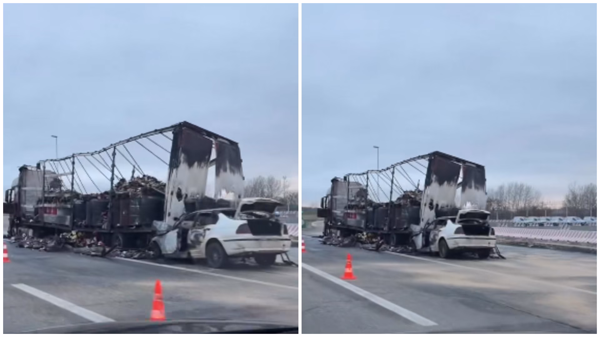 Според информации се судриле камион и патничко возило BMW, при што двете возила се запалиле и целосно изгореле.