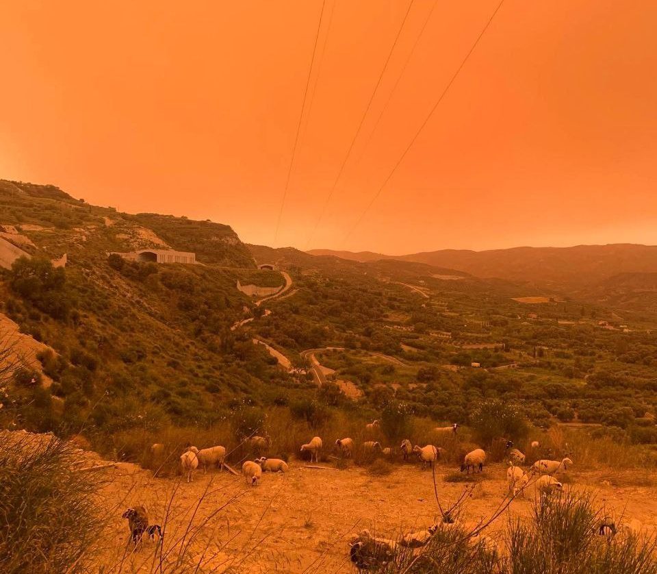 https://x.com/SprinterObserve/status/1927050470809272354?t=LyYcTZaQFQ9WtsZj8SyT_w&s=19Во исто време, возилата, куќите, дворовите, улиците, па дури и дрвјата беа покриени со дебел слој африканска прашина, односно песок, според медиумот.Жешкиот југозападен ветер и циклонот од Егејското Море повлекоа топол воздух и песок од Сахара, а температурата на Крит достигна 37 степени, а по продирањето на студениот фронт, се олади на 25 степени.