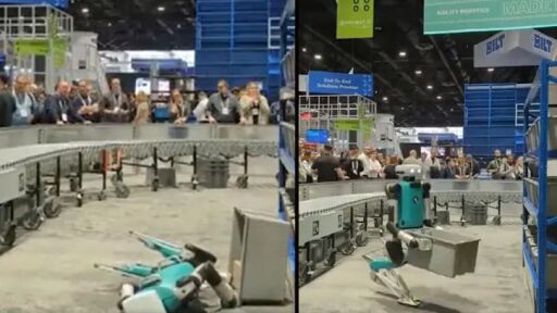 На видеото се гледа како роботот работи со часови и часови. Последните неколку снимки покажуваат како машината зема контејнер и набргу потоа се урива.