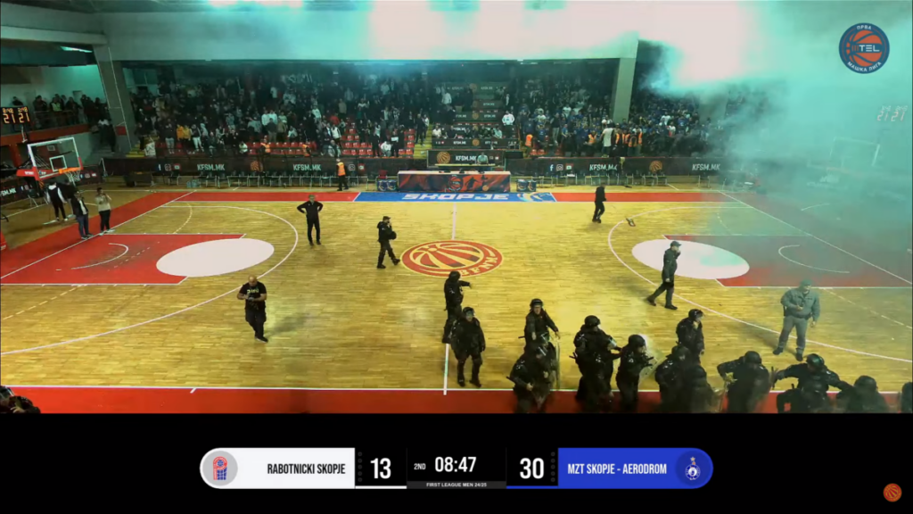 Најпрво се слушна пукање во близина на клупата на МЗТ, а потоа уште два пати, по што играчите се повлекоа во соблекувалните. Навивачите се гаѓаа меѓусебно со факели, а мораше да реагираат и специјалците.