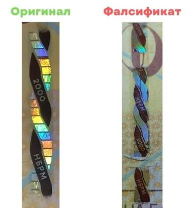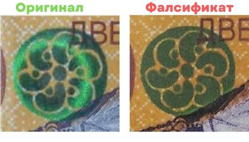 Фалсификуваната банкнота може да се препознае по основниот заштитен елемент, отпечатен со оптички варијабилна боја, којшто се наоѓа на горниот средишен дел на предната страна на банкнотата. Кај фалсификуваната банкнота, овој елемент воопшто не ја менува бојата со придвижување на банкнотата, додека кај оригиналните банкноти, со придвижување под одреден агол, може да се забележи како се менува неговата боја од зелена во сина и се појавува светлозелен прстен којшто симулира ефект на движење, како што е прикажано на сликата: