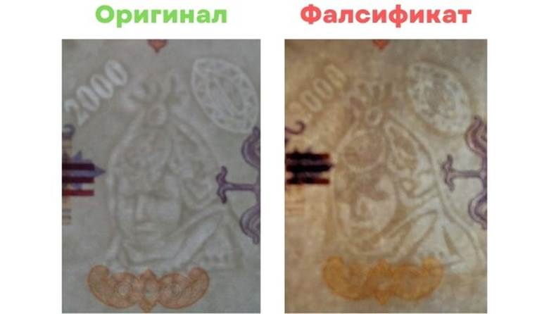 Исто така, фалсификуваните банкноти може да се препознаат и по водениот печат. Кај фалсификатот е имитиран со нанесување на основниот мотив со нијанса на жолтеникава и сива боја и е видлив, додека кај оригиналните банкноти е видлив единствено доколку се постави банкнотата под извор на светлина.