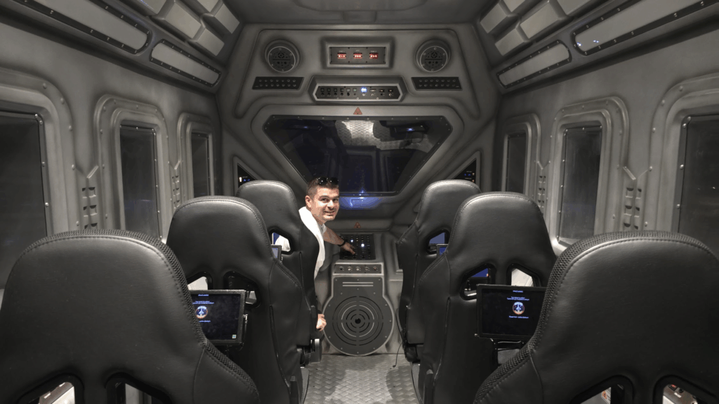 Првата фаза ве носи длабоко во моментот на лансирањето, кога динамичките платформи, вибрациите и зголемените g‑усилувања прават да се чувствувате како да сте во оригинална ракета. Потоа, за момент се наоѓате во виртуелна Меѓународна вселенска станица и го набљудувате сѐ низ прозорците во орбитата. Следува возбудлив лет кон Месечината, падините на лунарната површина, истражување на база и научни експерименти. И, конечно, симулацијата на враќањето на Земјата ја крунисува вашата мисија – по што добивате персонална „астронаутска картичка“. Секогаш во седишта на земја, но со уметнички создаден простор, звук и движење, сето тоа прави да се чувствувате дел од вселената, без вистинско плавање