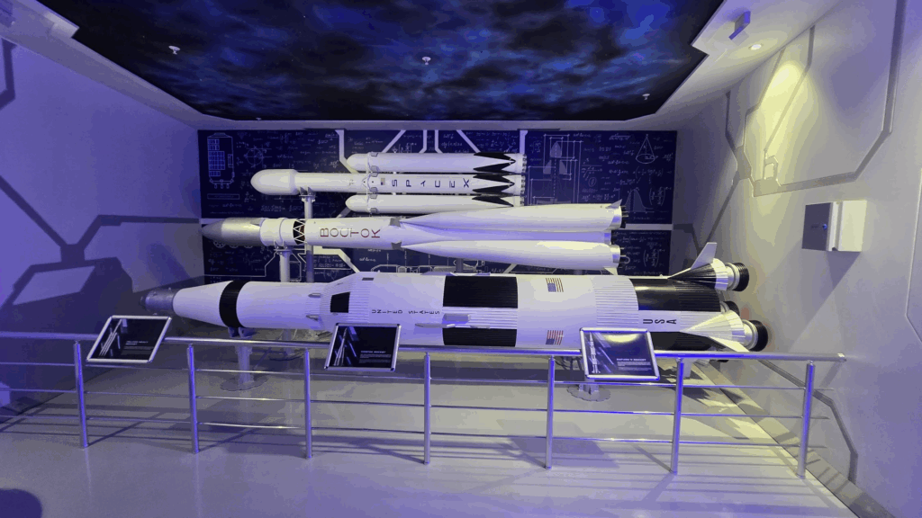 При влегувањето, посетителите од над три години влегуваат во просторија каде што низ шест богати модули се зборува за освоените вселенски премини. Група од максимум шест учесници заедно се впушта во авантура од осум фази што ги поврзува музејските експонати – модели на истакнати ракети и сателити – со интерактивни приказни и визуелни прикази на вселенските мисии