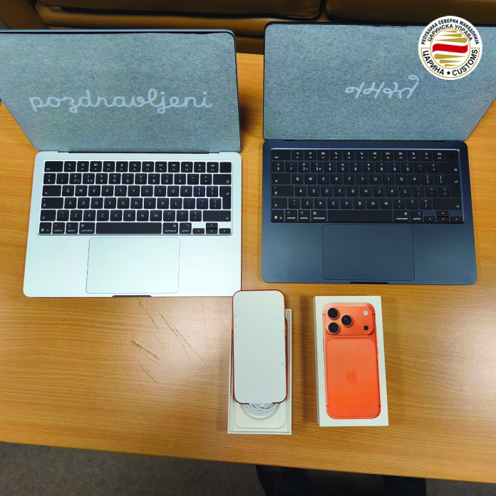 - Во друг случај царинските службеници од Меѓународен Аеродром Скопје при контрола на багаж на патник, македонски државјанин, кој допатувал со лет од Лондон пронајдоа два лаптопи и еден мобилен телефон од брендот „Ејпл“.