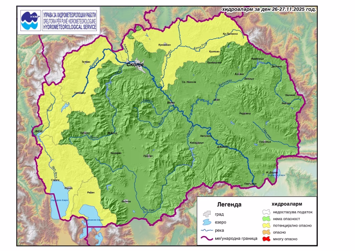 Управата за хидрометеоролошки работи (УХМР) издаде Жолто ниво на предупредување (Хидроаларм) за потенцијална опасност од поплави низ целата територија на Македонија. Предупредувањето се однесува на периодот од 26 до 27 ноември 2025 година.